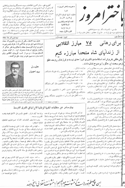 باختر امروز ـ شماره ٢١ در نیمه دوم آذر ١٣٥٠ منتشر شد bakhtare-emrooz-21Download Related 12. ژوئیه 202123. ژوئیه 2021 بهدست vahdat دستهها: نشریهها، باختر امروزبرچسبها: اسامی تعدادی از دستگیر شده گان، باختر امروز فارسی عربی، برای رهائی ٧٥ مبارز انقلابی از زندانهای شاه متحدانه مبارزه کنیم، جلیل سید احمدیان، دستگیری طاهر احمدزاره به دلیل اعتاض او به دستگیری فرزندانش و بی اطلاعی از آنها