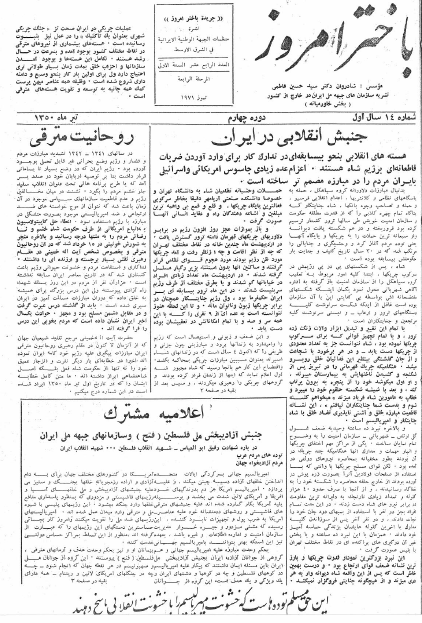 باختر امروز ـ شماره ۱٤ در تیر ١٣٥٠ منتشر شد bakhtare-emrooz-14Download Related 12. ژوئیه 202123. ژوئیه 2021 بهدست vahdat دستهها: نشریهها، باختر امروزبرچسبها: قیام سی تیر، هسته های انقلابی، اعلامیه مشترک فتح و سازمانهای جبهه ملی ایران، جنبش انقلابی ایران، خطابه خمینی، روحانیت مترقی، شهیدان گمنام