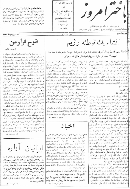باختر امروز ـ شماره ٢۳ در نیمه دوم بهمن ١٣٥٠ منتشر شد bakhtare-emrooz-23Download Related 13. ژوئیه 202123. ژوئیه 2021 بهدست vahdat دستهها: نشریهها، باختر امروزبرچسبها: مبارزه انقلابی در ترکیه، افشای یک توطئه رژیم، اولین اطلاعیه چریکهای فدائی خلق، ای جلاد ننگ ات باد، اخراج ایرانیان از عراق، اعلامیه شماره دو چریکهای فدائی خلق، خطابه خمینی در باره اخراج ایرانیان از عراق، دستگیری تعداد از حاضرین در تشیع جنازه شهید مرتضی شفیعها در قزوین، شکنجه گران و جاسوسان، شرح فرار رضا رضائی از زندان
