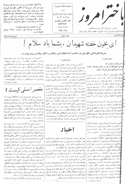 باختر امروز ـ شماره ٢۵ در فروردین ١٣٥۱ منتشر شد bakhtare-emrooz-25Download Related 13. ژوئیه 202123. ژوئیه 2021 بهدست vahdat دستهها: نشریهها، باختر امروزبرچسبها: فاشیسم در ترکیه، مقصر اصلی کیست؟، مسعود احمد زاده دو روز قبل از اعلام ادامش زیر شکنجه شهید شد، معجزه گران، پیروزی خلق ویتنام پیروزی بشریت است، اخبار، بیانیه شماره ۵ و ۶ چریکهای فدائی خلق در باره اعدام ها، تلگراف همبستگی