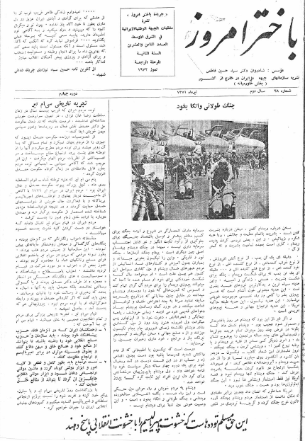 باختر امروز ـ شماره ٢۸ در تیر ١٣٥۱ منتشر شد bakhtare-emrooz-28Download Related 14. ژوئیه 202123. ژوئیه 2021 بهدست vahdat دستهها: نشریهها، باختر امروزبرچسبها: مبارزه انقلابی در سیلان، اخبار، اطلاعیه چریکهای فدائی خلق، اطلاعیه از عملیات نظامی چریکهای فدائی خلق، تفاهم دراز مدت شاهانه، تجربه تاریخی سی ام تیر، جنگ طولانی و اتکا به خود ویتنام، جنایات ارتجاع، شهادت زیر شکنجه