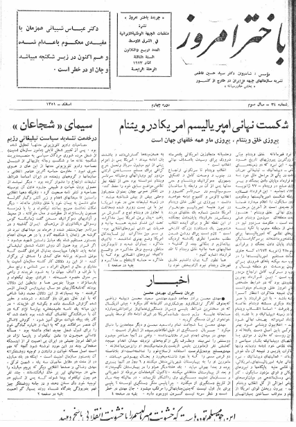 باختر امروز ـ شماره ۳٤ در اسفند ١٣٥۱ منتشر شد bakhtare-emrooz-34Download Related 16. ژوئیه 202123. ژوئیه 2021 بهدست vahdat دستهها: نشریهها، باختر امروزبرچسبها: نامه مسعود رجوی از زندان، اخبار، جریان دستگیری مهدی محسن، سیمای "شجاعان" در خدمت تبلیغات تلوزیونی رژیم شاه، شکست نهائی امپریالیسم آمریکا در ویتنام