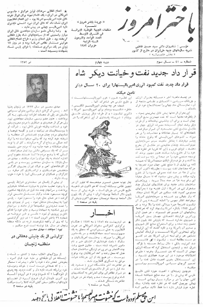 باختر امروز ـ شماره ٤۱ در تیر ١٣٥٢ منتشر شد bakhtare-emrooz-41Download Related 20. ژوئیه 202123. ژوئیه 2021 بهدست vahdat دستهها: نشریهها، باختر امروزبرچسبها: قرارداد جدید نفت و خیانت دیگر شاه، لیست عده ای از دستگیر شدگان مردم لار ، لوز و جهرم از استان فارس، نامه ای از ایران، گزارشی از یک جنبش دهقانی در منطقه زنجان، اخبار، به مناسبت سالگرد شهادت مجاهد احمد رضائی، زندگی نامه مهدی محسن مجاهد مبارز، شعری از محمد بازرگانی مجاهد شهید که در شکنجه گاه اوین شروده است