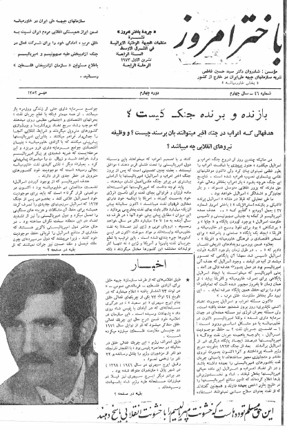 باختر امروز ـ شماره ۴۶ در مهر ١٣٥٢ منتشر شد bakhtare-emrooz-46Download Related 23. ژوئیه 202123. ژوئیه 2021 بهدست vahdat دستهها: نقد و نظر، باختر امروزبرچسبها: پیام خمینی به دول اسلامی، اخبار، بازنده و برنده جنگ کیست؟، شهادت ایرج سپهری در آبادان، شعری بخاطر مستوره احمدزاده
