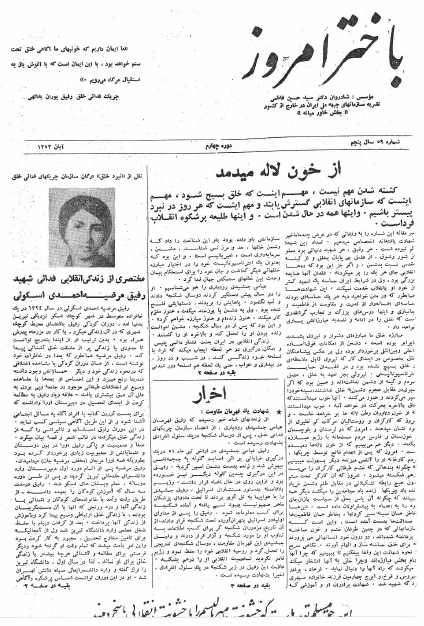باختر امروز ـ شماره ۵۹ در آبان ١٣٥۳ منتشر شد bakhtare-emrooz-59Download Related 29. ژوئیه 2021 بهدست vahdat دستهها: نشریهها، باختر امروزبرچسبها: مختصری از زندگی مرضیه احمدی اسکوئی، نقل از نبرد خلق ارگان سازمان ان سازمان چریکهای فدائی خلق، اخبار، از خون لاله میدمد، شهدادت یک چریک در جبهه نبرد منطقه ای، عملیات انفجاری مجاهدین خلق در پشتبانی از اعتصاب کارگران