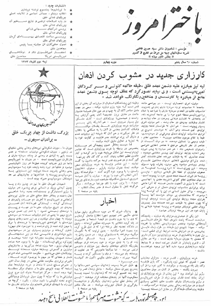 باختر امروز ـ شماره ۶۰ در نیمه دوم آذر ١٣٥۳ منتشر شد bakhtare-emrooz-60Download Related 29. ژوئیه 2021 بهدست vahdat دستهها: نشریهها، باختر امروزبرچسبها: کارزار جدید در مشوب کردن اذهان، انتشارات جدید، اخبار مبارزات در ایران، بزرگ داشت از چهار چریک خلق برادران سپهری، خاطره گروه ایوذر