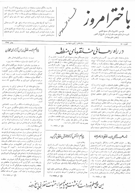 باختر امروز ـ شماره ۷۰ در بهمن ١٣٥۴ منتشر شد bakhtare-emrooz-70Download Related 10. آگوست 2021 بهدست vahdat دستهها: نشریهها، باختر امروزبرچسبها: مصاحبه با رفیق ماجد ابوشرار، مصاحبه با رفیق احمد جبریل، نامه همبستگی جبهه خلق در بحرین، نامه احمد جبریل به چریکهای فدائی، پیام ارتش ازادیبخش خلق ترکیه به چریکهای فداپی، پیام جبهه خلق برای آزادی عمان به چریکهای فدائی، انتشار کتاب به زبان عربی، در راه رهائی خلقهای منطقه