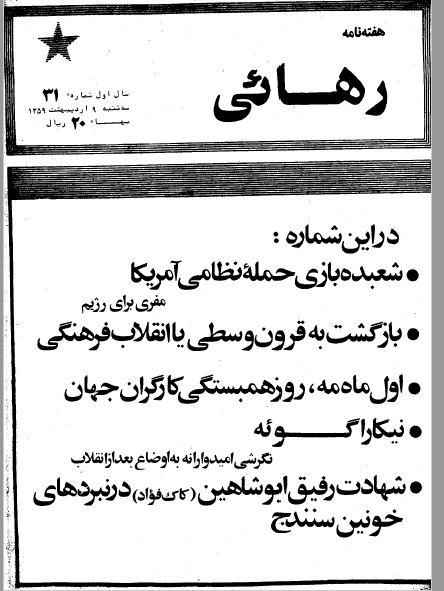 رهائی دوره دوم – شماره ٣١ منتشزه در ۹ اردیبهشت ۱۳۵۹ رهائی دوره دوم شماره ۳۱Download Related 6. آگوست 202230. آگوست 2024 بهدست vahdat دستهها: نشریهها، رهایی دوره دومبرچسبها: نیکاراگوئه، نبرد سنندج، اول ماه مه روز همبستگی کارگران جهان، بازگشت به قرون وسطی یا انقلاب فرهنگی، شهادت رفیق ابوشاهین، شعبده بازی حمله نظامی آمریکا