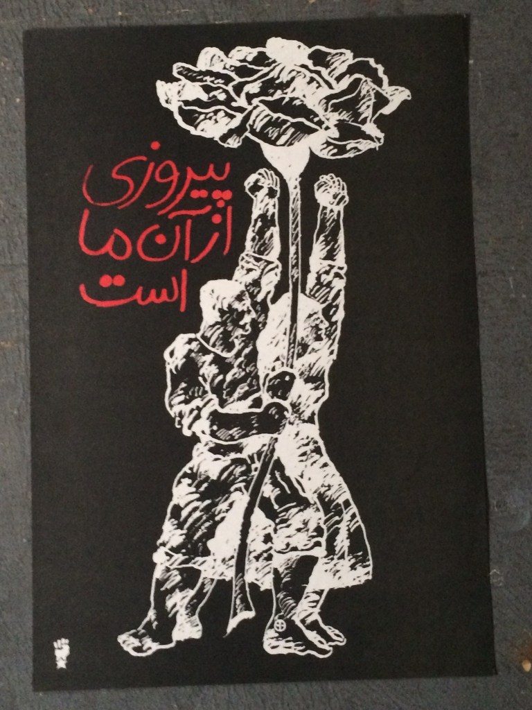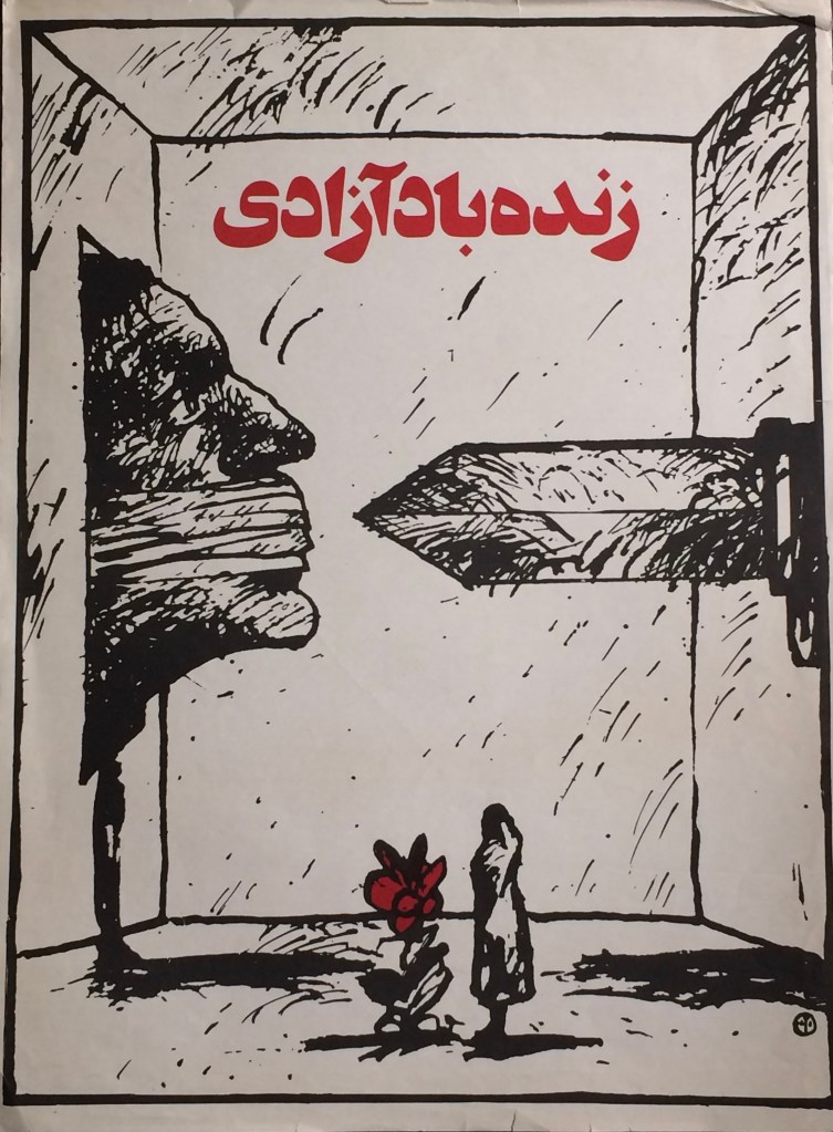 از کارهای کارگاه تولید پوستر، دانشکده هنرهای زیبا، دانشگاه تهران، سال ۱۳۵۸؛ مسئول: نیکزاد نجومی