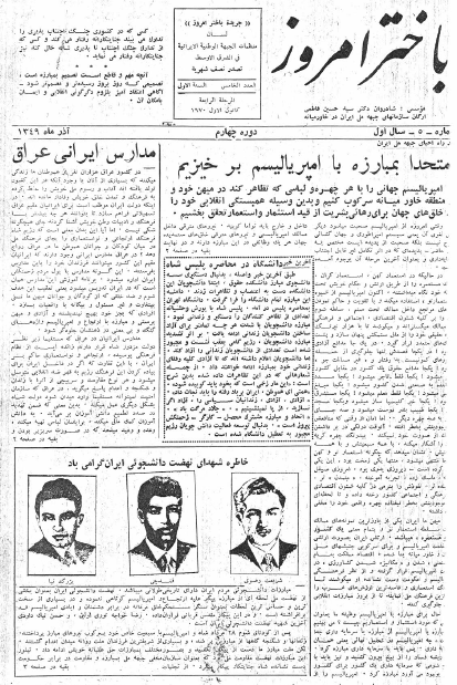 باختر امروز ـ شماره ۷ در نیمه دوم دی ١٣۴۹ منتشر شد bakhtare-emrooz-07Download 11. ژوئیه 202123. ژوئیه 2021 بهدست vahdat دستهها: نشریهها، باختر امروزبرچسبها: موج نوین مبارزه، مالکیت ماشین، محاکمه ۱۸ تن دیگر از گروه فلسطین، مدارس ایرانی در عراق، احمد صبوری از کرو فلسطین خود را به سازمان امنیت رژیم شاه فروخت، حمایت بشریت از مبارزات خلق ویتنام، روابط ایران و آلمان، سند توطئه رژیم شاه علیه آزادیخواهان خاورمیانه، سالگرد شهادت تختی